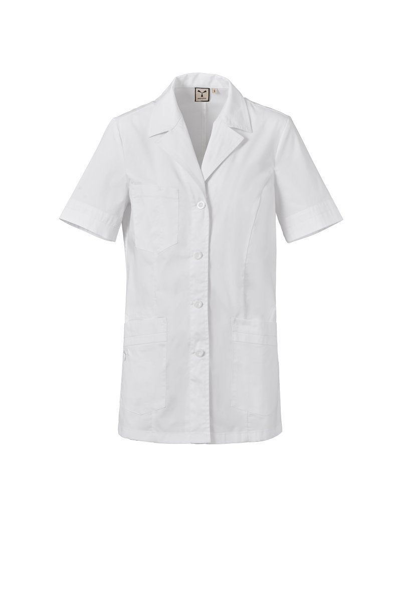 Dameswerkjas met korte mouwen en klassieke reverskraag, gemaakt van katoenpoplin, polyester en Lycra® T400®, met uitstekende elastische en ademende eigenschappen. Zichtbare knoopsluiting met vier knoopsgaten. Drie opgestikte zakken: één op de borst met een pennenvakje; twee lagere zakken, waarvan één met de iconische Payper-propeller in ton-sur-ton geborduurd, en een binnenzak voor een smartphone. Contrasterende stoffen inzetstukken aan de onderkant van de mouwen en de onderste zakken. Achterpand met een centrale split en een vaste halve riem op taillehoogte voor een betere pasvorm.