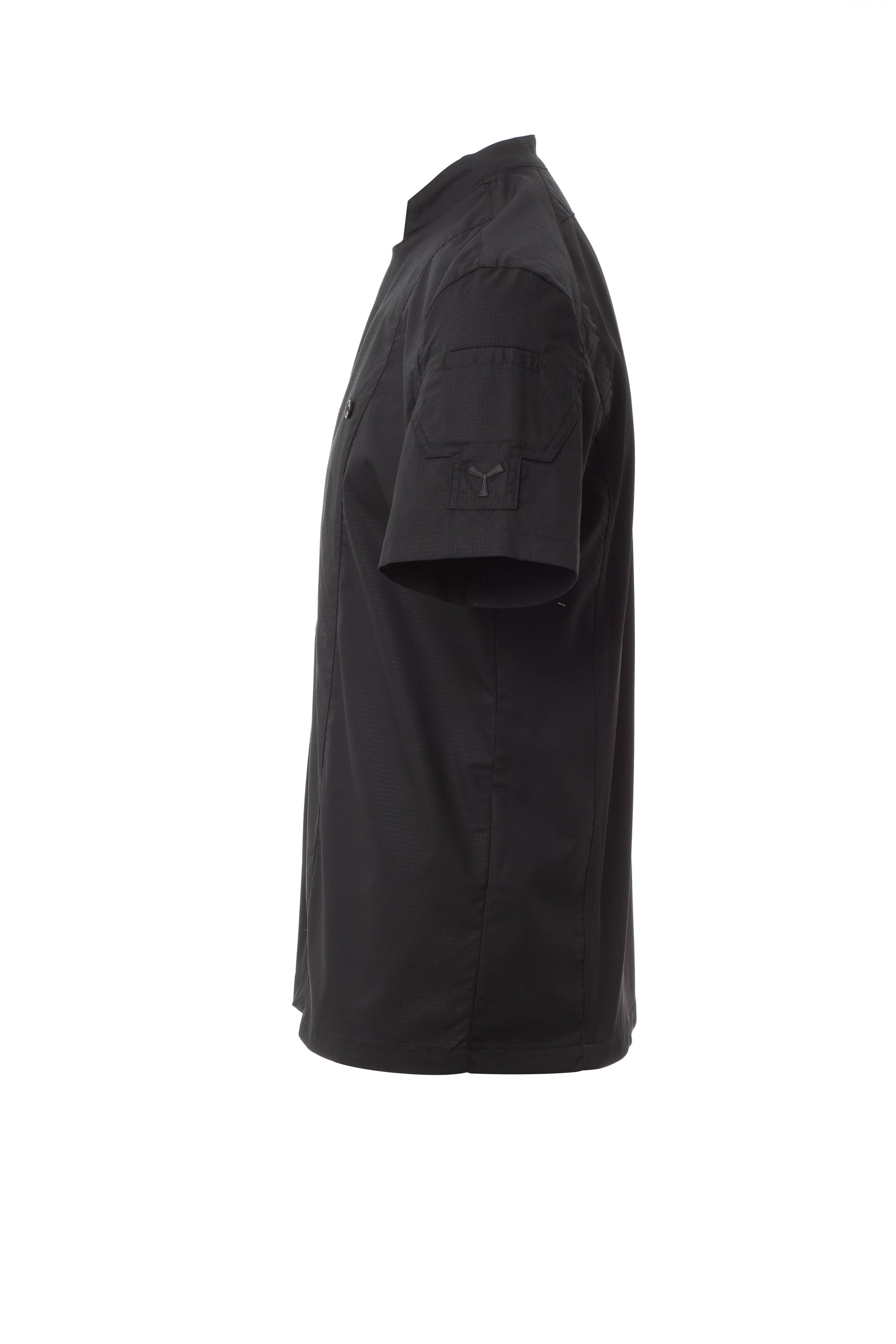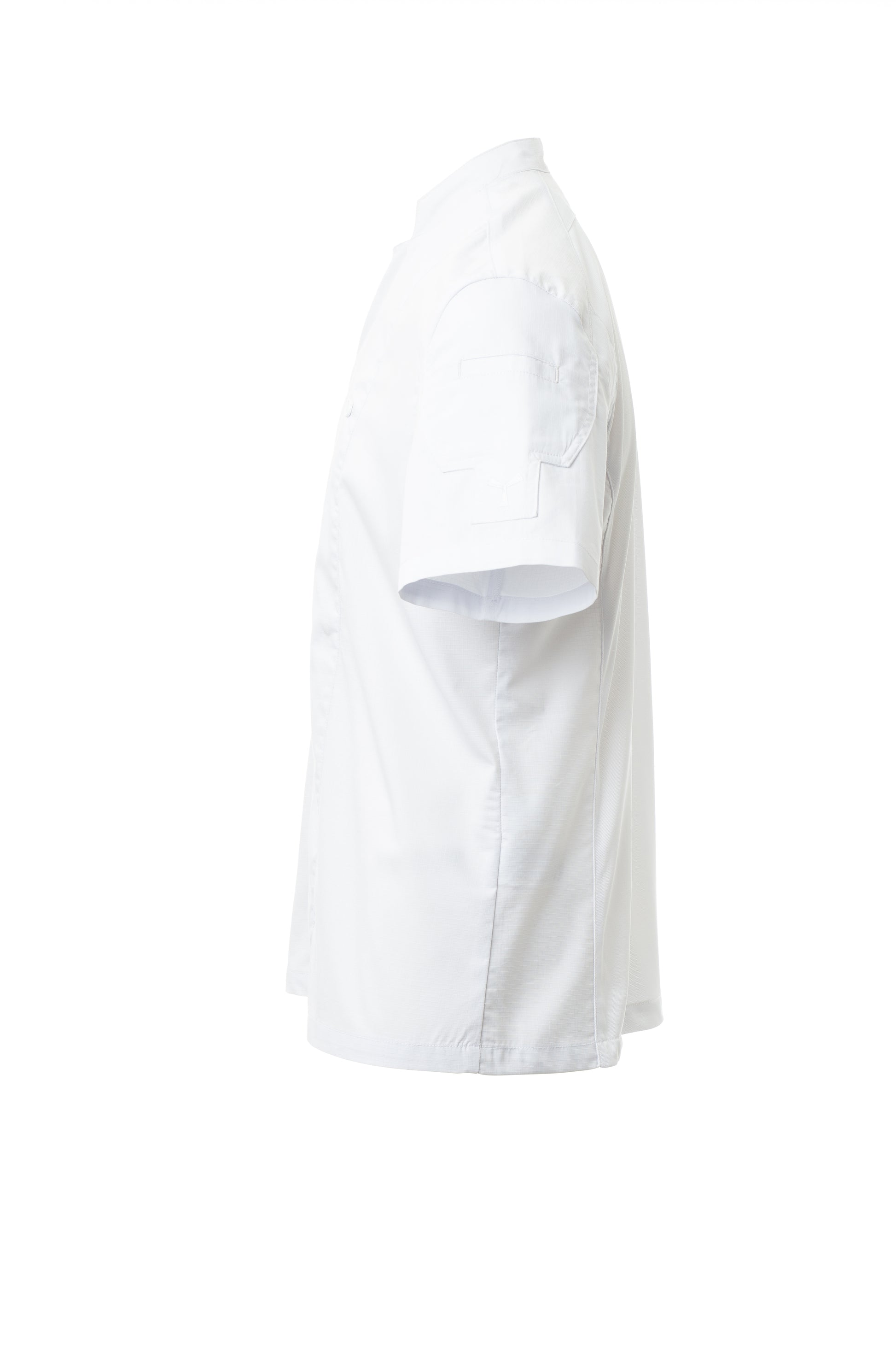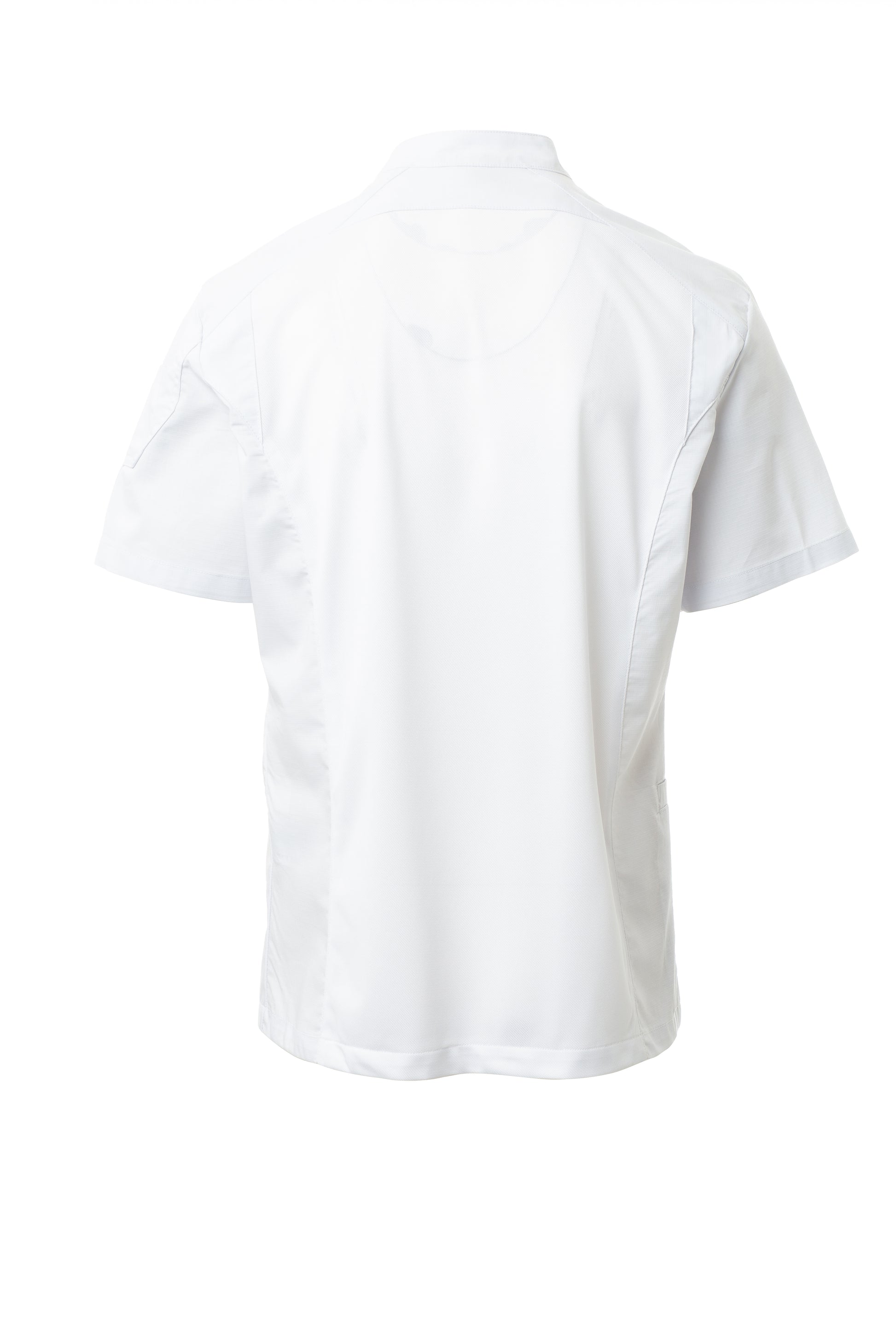 Chefjas voor heren met opstaande kraag, gemaakt van katoenripstop en Lycra® T400®, met uitstekende elastische en ademende eigenschappen, en met comfortabele meshstof op de rug en bij de armsgaten voor extra ventilatie. Dubbele rij knopen met drukknopen, een opvouwbare flap die met een zichtbare knoop op de borst kan worden vastgemaakt voor een getailleerde revers en een innovatieve V-hals. Korte mouwen met zoom. Iconisch gevormd embleem op de linkerschouder, met ton-sur-ton propellerborduurwerk, compleet met pennenzakje. Praktisch smartphonevakje in de taille.