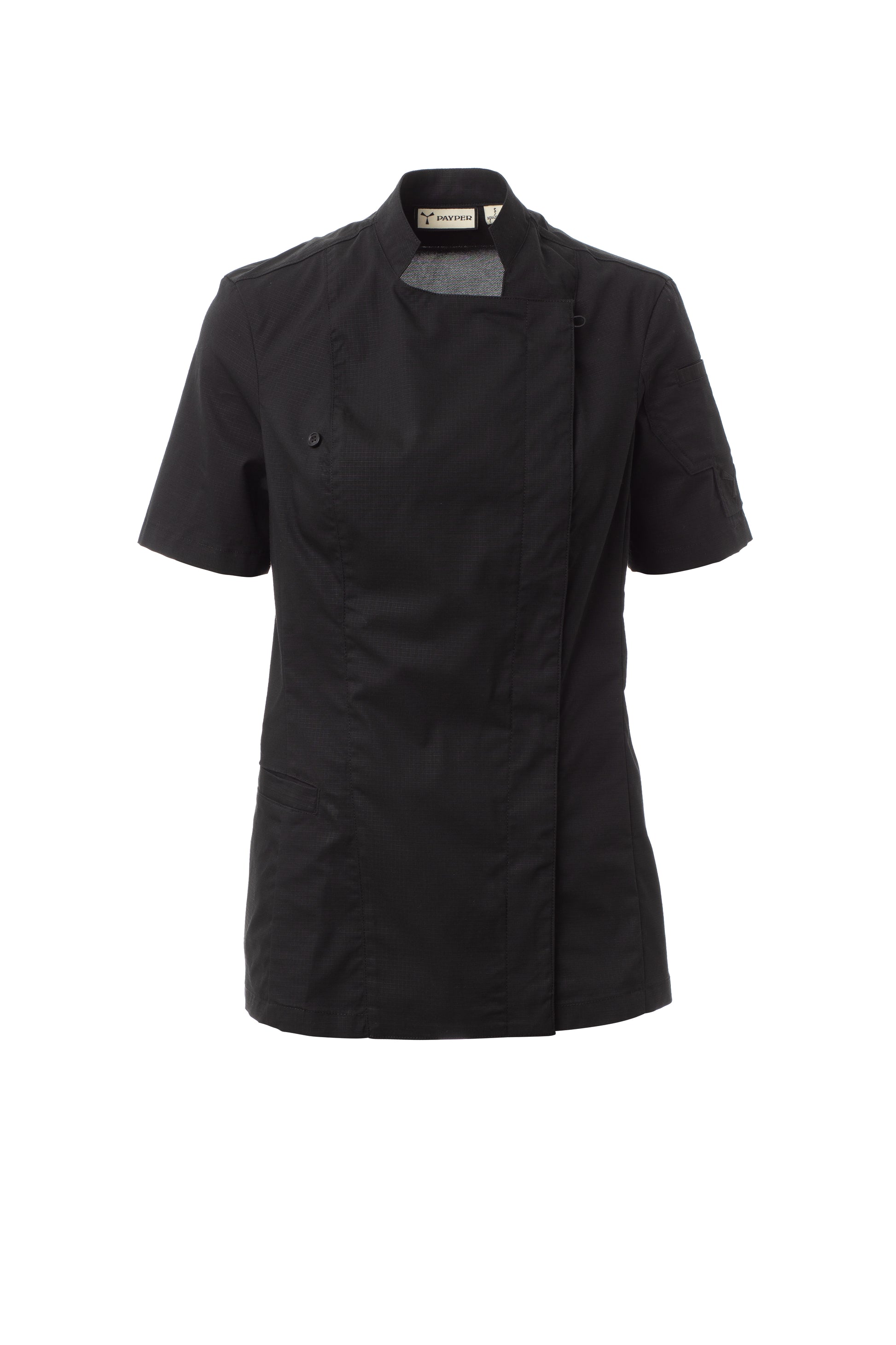 Dameskoksjas met opstaande kraag, gemaakt van katoenripstop en Lycra® T400®, met uitstekende elastische en ademende eigenschappen, en met comfortabele meshstof op de rug voor extra ventilatie. Dubbele rij knopen met drukknopen, een opvouwbare flap die met een zichtbare knoop op de borst kan worden vastgemaakt voor een getailleerde revers en een innovatieve V-hals. Korte mouwen met zoom. Iconisch gevormd embleem op de linkerschouder, met ton-sur-ton propellerborduurwerk, compleet met pennenzakje. Praktisch smartphonevakje in de taille.